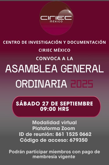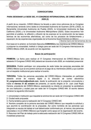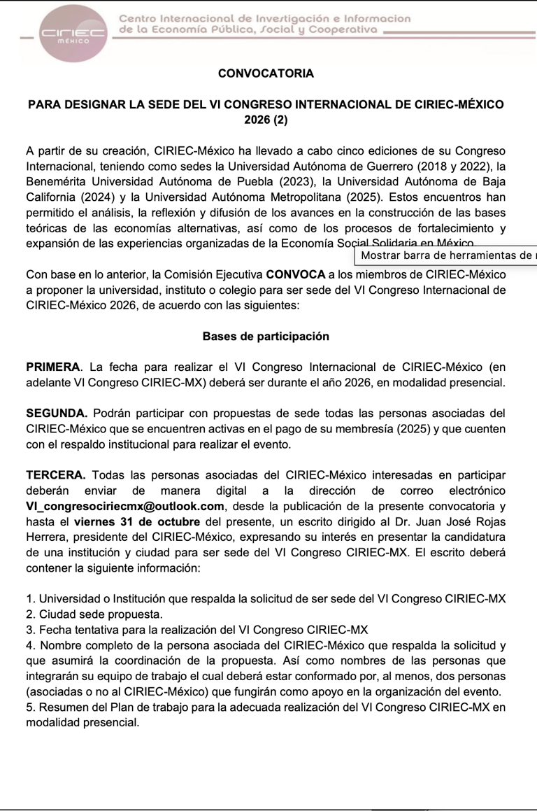 El dinamismo de esta página está en relación con el quehacer científico y en territorio de los miembros de CIRIEC México, de sus aliados y de todas aquellas personas interesadas en la ESS, por lo tanto, es de nuestra propiedad, de todos nosotros. Por lo que les pedimos su participación, la cual enriquecerá, sin duda, este espacio.